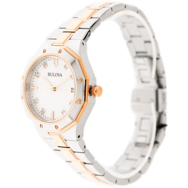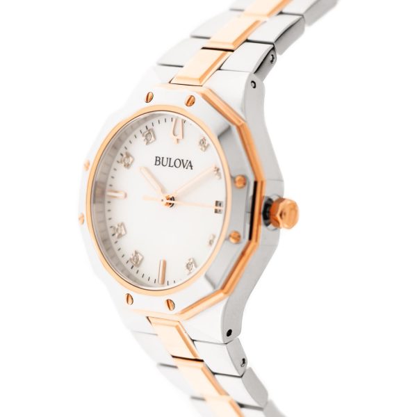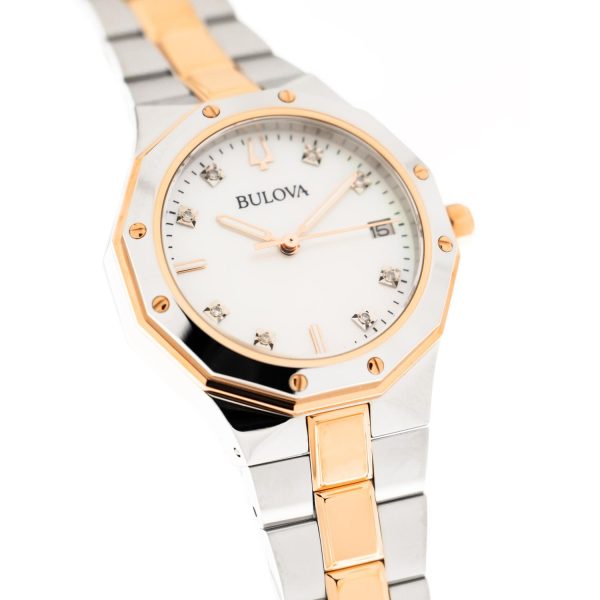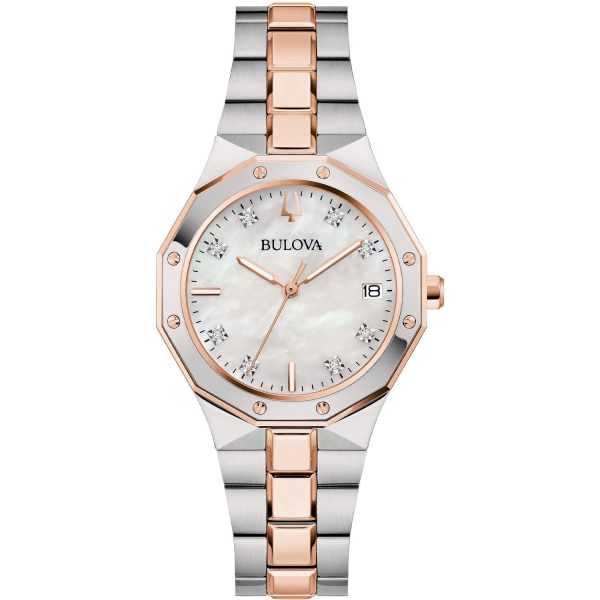 Introducing the BULOVA 98P235 Octagon Lady Diamonds timepiece, a sublime fusion of elegance and sophistication. Crafted with precision and finesse, this exquisite watch exudes luxury from every angle. The octagonal case, enveloped in steel and adorned with dazzling diamonds, houses a mesmerizing MadrePearl dial that dances with iridescence.