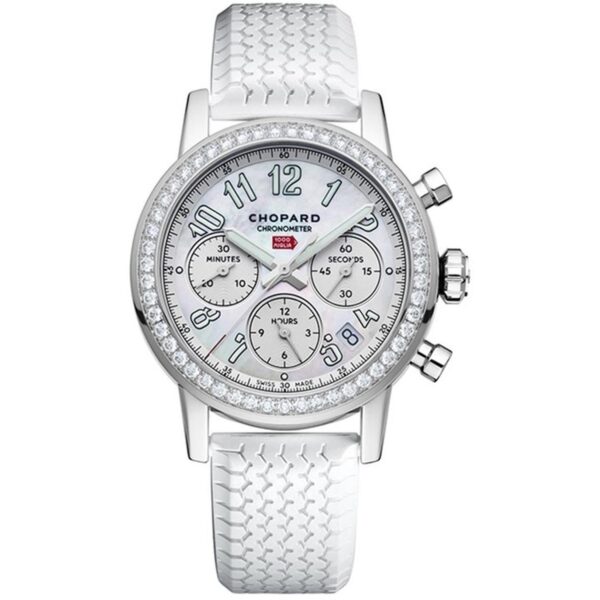 Indulge in the timeless elegance of the CHOPARD Mille Miglia Classic Chronograph, a masterpiece of horological craftsmanship. This exquisite women’s watch features a lustrous Madreperla dial encased in steel, complemented by a Bianco Gomma strap for a luxurious touch. With a case diameter of 39mm and water resistance up to 5 ATM, this automatic timepiece blends sophistication with functionality. The steel and diamond bezel adds a touch of opulence, while the sapphire glass ensures durability and clarity. Embrace the allure of Chopard with the 178588-3001, a true symbol of refined taste and exquisite style.