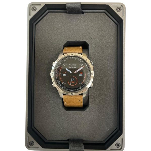 Introducing the exquisite GARMIN MARQ® Adventurer (Gen 2) timepiece, a pinnacle of sophistication and functionality in men’s watches. Crafted with precision, this watch features a sleek titanium case, complemented by a luxurious brown leather strap with a sturdy steel clasp. The stunning black dial, devoid of numerals, is protected by scratch-resistant sapphire glass and encased in a titanium bezel.