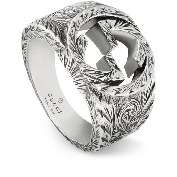 Immerse yourself in the exquisite allure of the GUCCI YBC455302001 ring crafted from aged sterling silver, boasting the iconic Interlocking G motif. This handcrafted masterpiece exudes sophistication and luxury, a testament to GUCCI’s unparalleled craftsmanship. Elevate your ensemble with this timeless piece that effortlessly captures the essence of elegance and refinement. A true statement of style and sophistication, this ring is a must-have for those who appreciate the finer things in life.