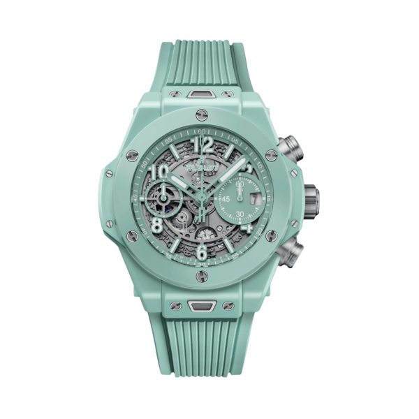 Introducing the HUBLOT 441.GS.5221.RX – BIG BANG UNICO MINT GREEN CERAMIC 42 MM, a masterpiece in men’s watches. Crafted with meticulous attention to detail, this timepiece features an automatic winding mechanism, a mesmerizing skeletonized dial, and a case made of luxurious ceramic. The rubber strap ensures both comfort and style, secured with a deployant clasp for a seamless fit. With a 42mm case diameter and water resistance up to 10 ATM, this watch is as durable as it is exquisite. The sapphire glass material enhances both the aesthetics and durability of this timepiece, embodying the essence of sophistication and precision. Elevate your wrist game with the HUBLOT 441.GS.5221.RX – where elegance meets innovation.