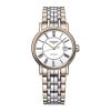 As part of the brand’s iconic collection, the Présence embodies timeless elegance with its sleek design and precise Swiss craftsmanship. The classic white dial is adorned with Roman numeral markers, exuding a sense of timeless luxury.
