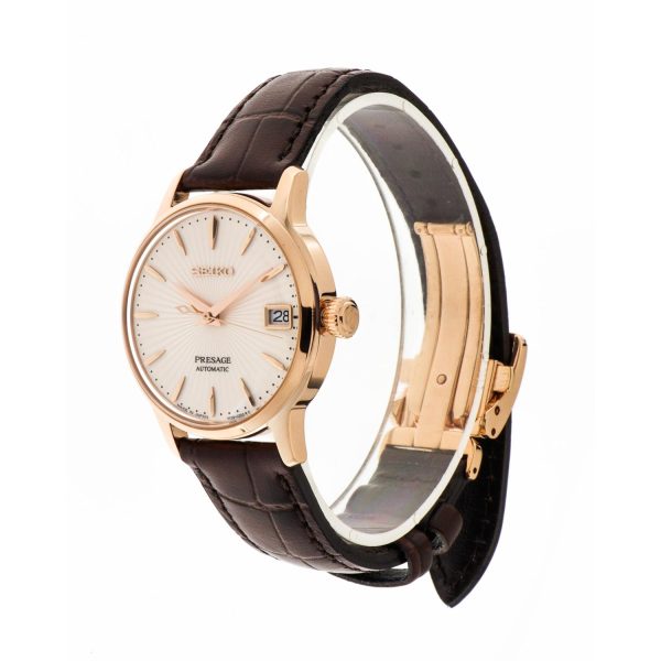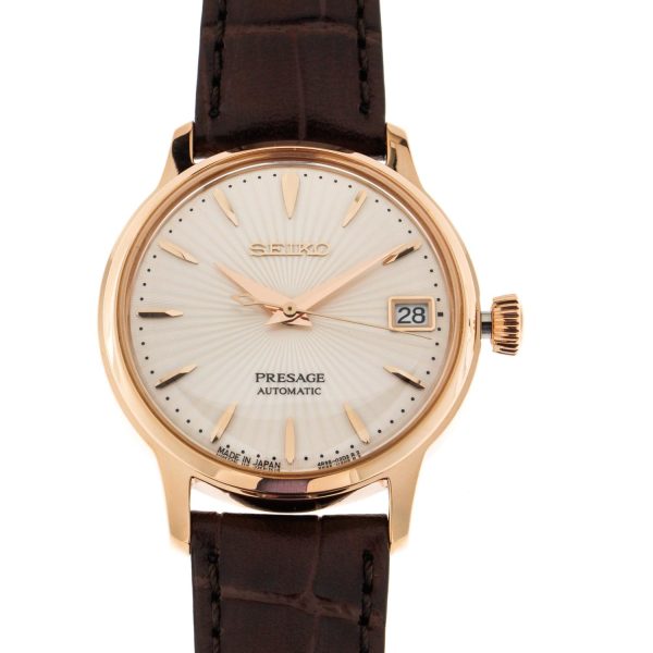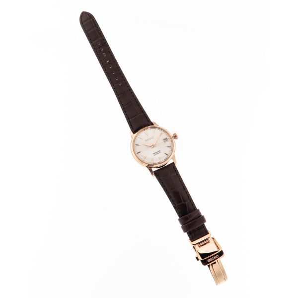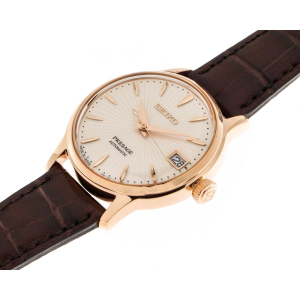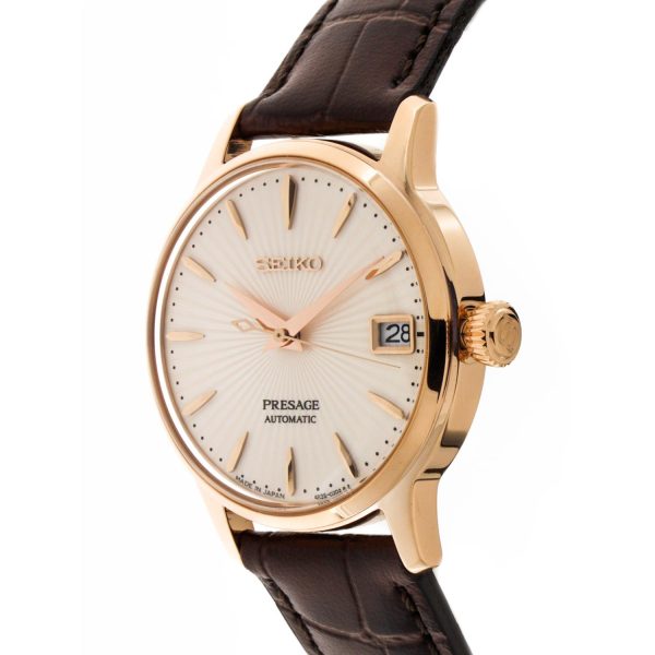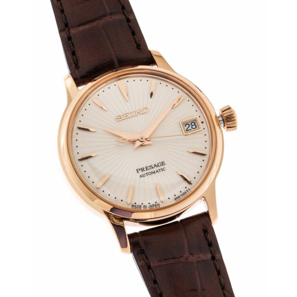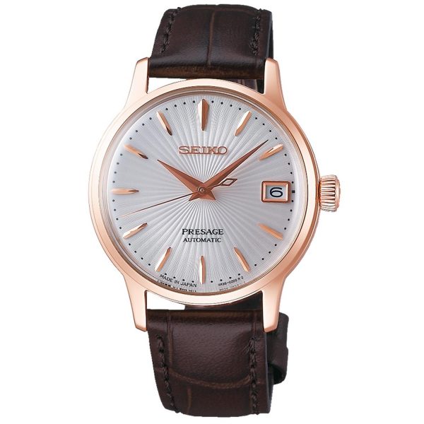 Indulge in the exquisite allure of the SEIKO SRP852J1 Presage Cocktail Time watch, a masterpiece of sophistication and refinement. This automatic timepiece, with its captivating silver dial free of numerals, is encased in steel, exuding timeless elegance. The brown leather strap, secured with a deployant clasp, complements the 33.8mm diameter case with a slender profile of 11.3mm. Water-resistant up to 5 bar, this horological gem boasts a hardlex crystal glass and a steel bezel. The automatic caliber with manual winding, adorned with 23 stones, ensures precision and reliability. Elevate your wrist with the SEIKO SRP852J1, a symbol of luxury and craftsmanship.