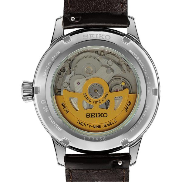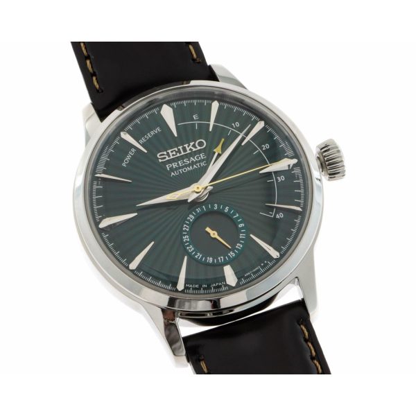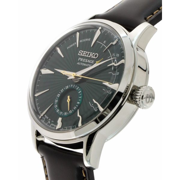 Introducing the SEIKO SSA459J1 from the revered Presage Cocktail Time collection. Crafted for the modern gentleman, this automatic timepiece exudes sophistication and refinement. The lush Verde dial is housed in a steel case, complemented by a luxurious brown leather strap secured with a deployant clasp. With a case diameter of 40.5mm and a water resistance of 5 bar, this watch seamlessly blends style and functionality. The SSA459J1 features a Hardlex glass, steel bezel, and is powered by the esteemed 4R57 caliber, epitomizing precision and elegance. Elevate your ensemble with this horological masterpiece.