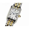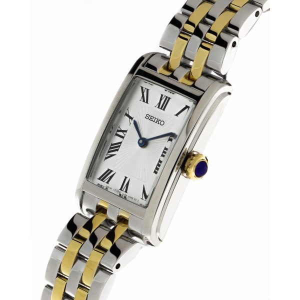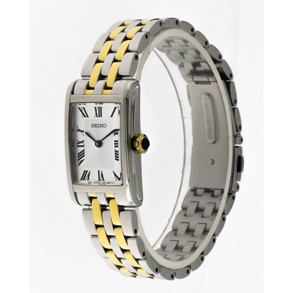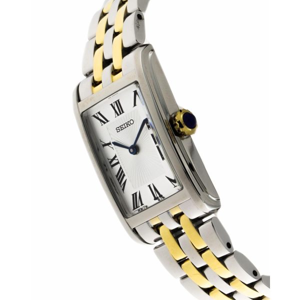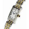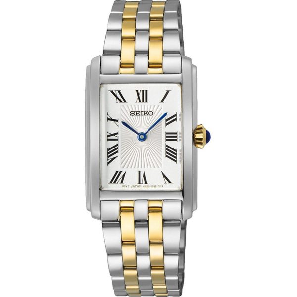 The SWR087P1 features a quartz movement housed in a steel case, adorned with Roman numerals on a pristine white dial. The two-tone steel gold strap adds a touch of opulence, secured with a deployant clasp for seamless wear.